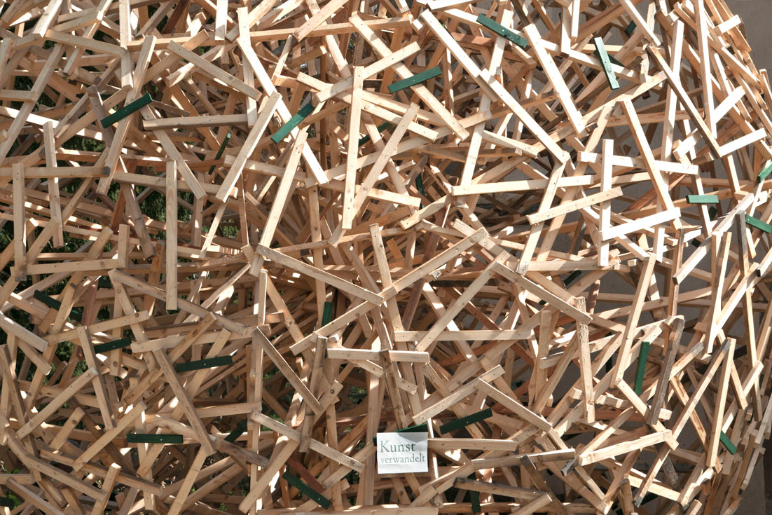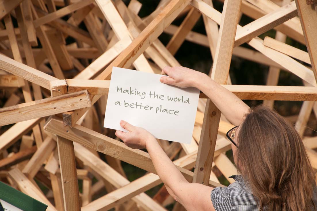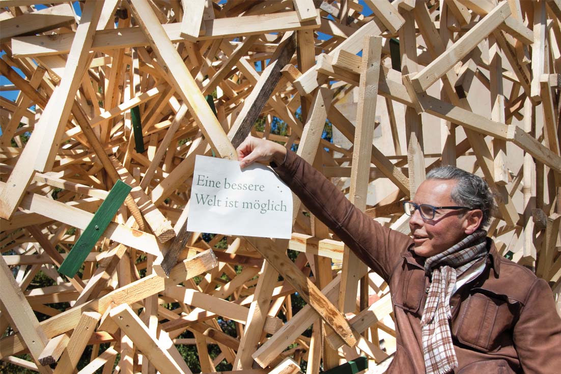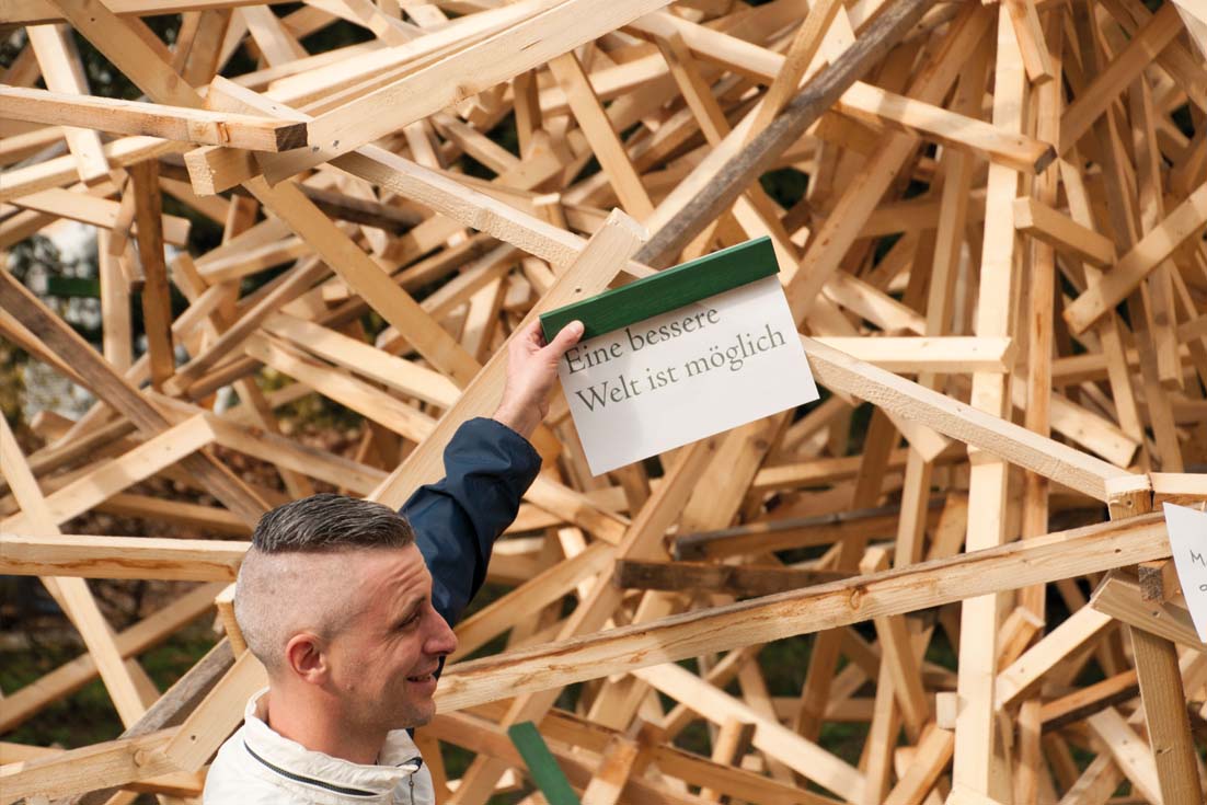 Auf einer weiteren Symbolebene nehmen die grünen Holzsegmente Bezug auf den europäischen „Green Deal“, der sich als Wandelprojekt für Klima und Mensch versteht und sich zum Ziel gesetzt hat, bis 2050 die Netto-Treibhausemissionen auf null zurückzuführen, eine Kreislaufwirtschaft zu etablieren und wichtige Bodendiversitätsziele zu erreichen. Dieser „Green Deal“ könnte zum Identifikationsprojekt für den gesamten Weltenkreis werden.