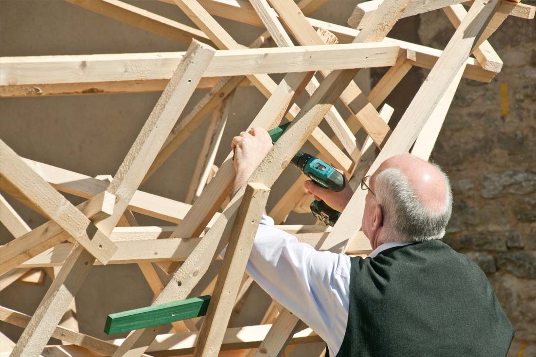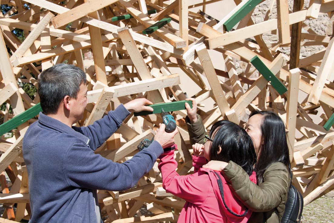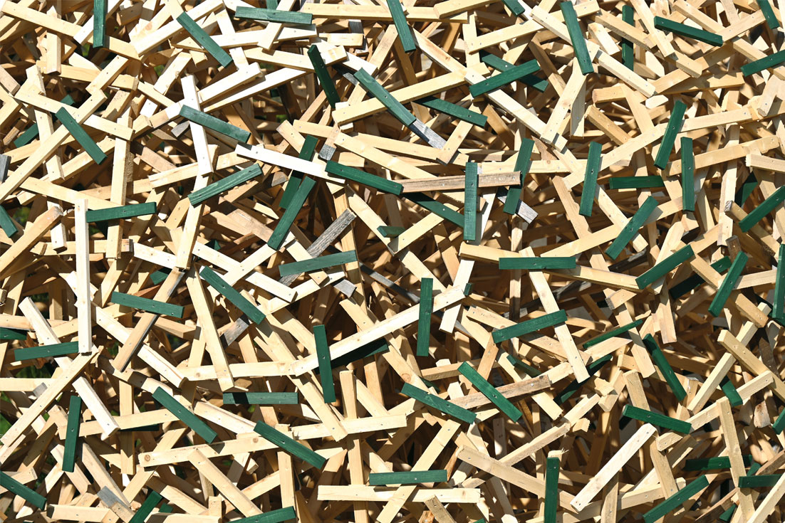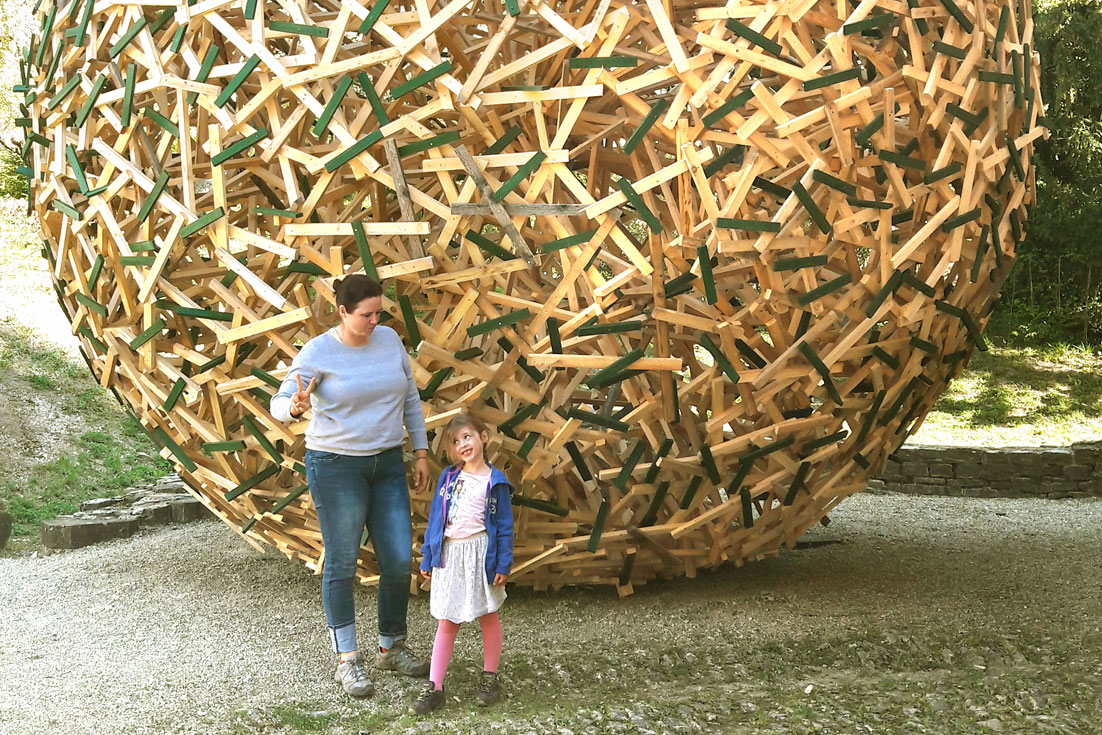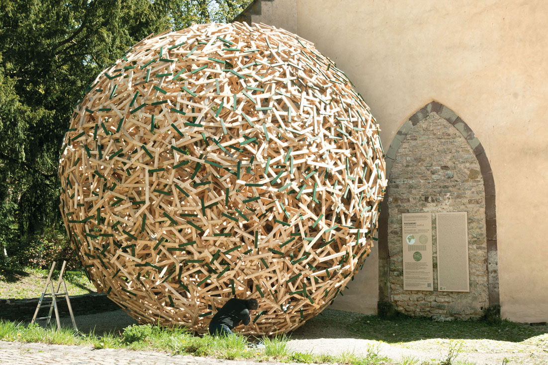 Auf einer weiteren Symbolebene nehmen die grünen Holzsegmente Bezug auf den europäischen „Green Deal“, der sich als Wandelprojekt für Klima und Mensch versteht und sich zum Ziel gesetzt hat, bis 2050 die Netto-Treibhausemissionen auf null zurückzuführen, eine Kreislaufwirtschaft zu etablieren und wichtige Bodendiversitätsziele zu erreichen. Dieser „Green Deal“ könnte zum Identifikationsprojekt für den gesamten Weltenkreis werden.