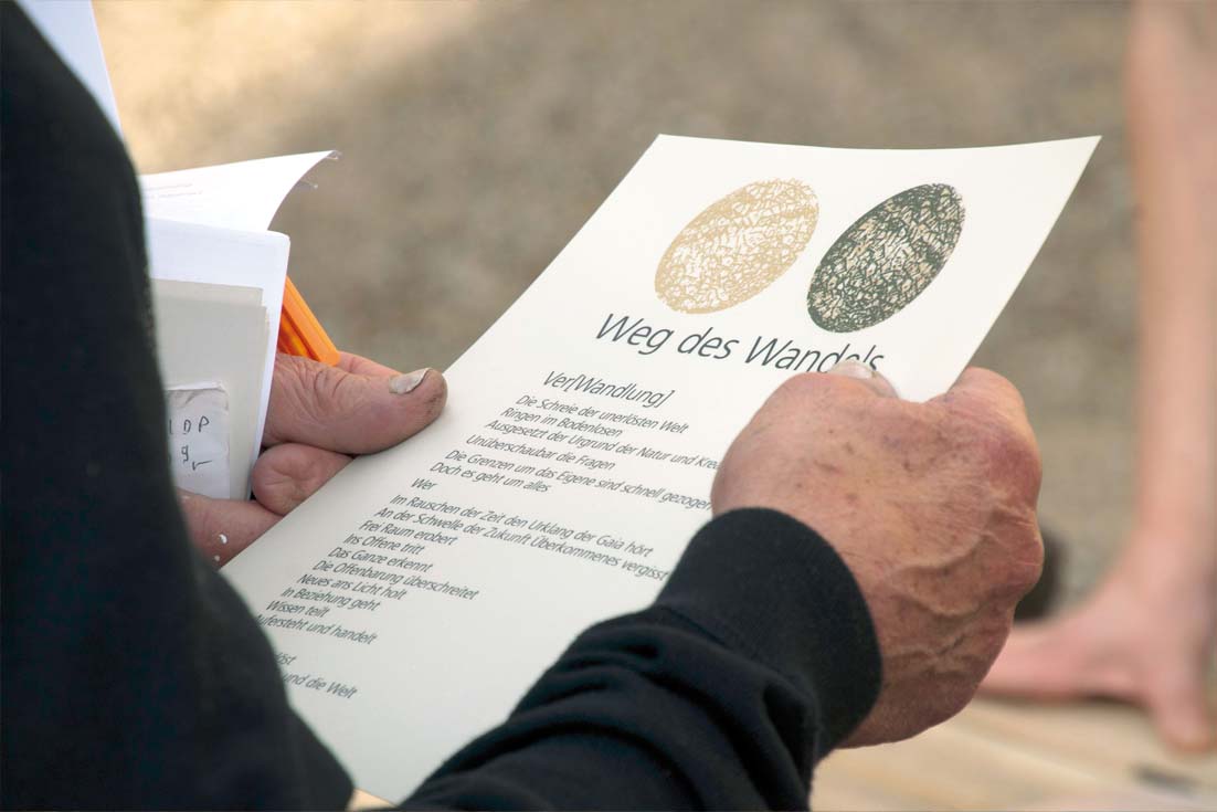 Sie sind daher herzlich eingeladen, einmal ganz bewusst Ihre Fähigkeiten künstlerisch [poetisch] zu sehen und zu denken und vor Ort auszuloten. Wir würden uns freuen, wenn Sie uns Ihre Erfahrungen bei dieser Übung mitteilen und sich auf diese Weise am künstlerischen Prozess beteiligen würden. Sie leisten damit einen wichtigen Beitrag, neue Wege bei der ästhetischen und kulturellen Bildung für nachhaltige Entwicklung zu erforschen!