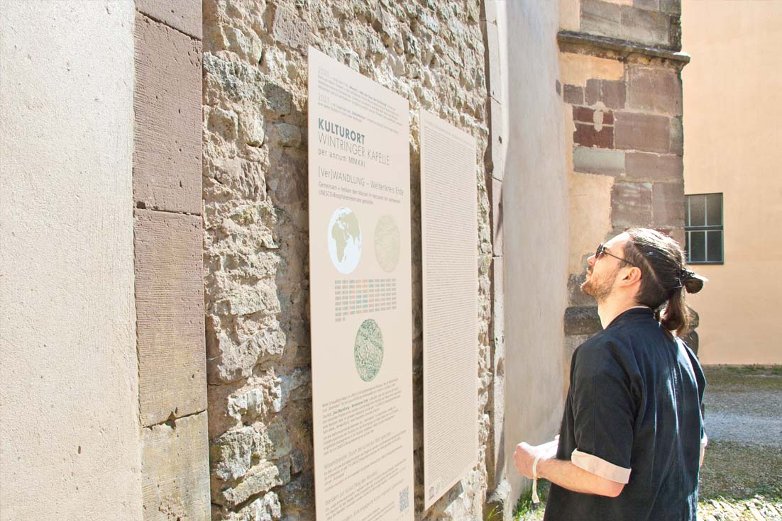Bitte nehmen Sie sich Zeit, das Kunstwerk und den Ort aufmerksam und geduldig zu betrachten und auf sich einwirken zu lassen. Lesen Sie die Informationen zu den Hintergründen des Kunstwerkes und des Ortes und auch das Gedicht dazu. Umgehen Sie achtsam das mittelalterliche Kulturdenkmal KulturOrt Wintringer Kapelle und nehmen Sie sich Zeit, in aller Stille, im Innenraum des Ortes innezuhalten. Ertasten Sie mit allen Sinnen den Raum und spüren Sie Ihren Gedanken und inneren Bildern nach. In diesem meditativen Zustand kann der Verstand neue Verknüpfungen herstellen. Diese schöpferische Auseinandersetzung mit dem Ort und der Kunst ist eine wesentliche Voraussetzung einen Wandel der Sichtweisen einzuleiten.
